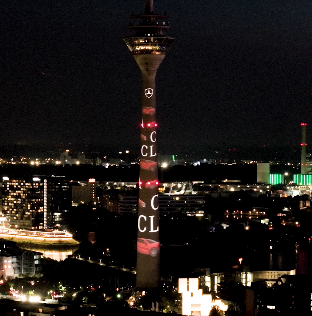 Zum Auftakt der Launch-Kampagne für den neuen Mercedes CLA setzte das Team von Zander & Partner den Düsseldorfer Rheinturm mit einer imposanten Lichtinszenierung in Szene.